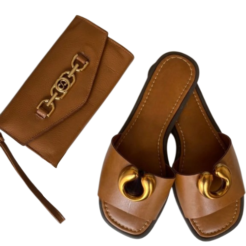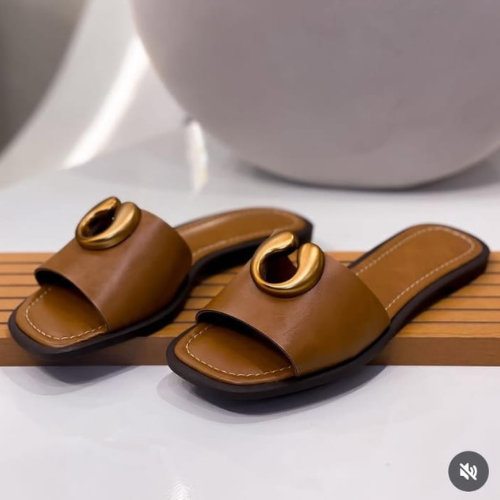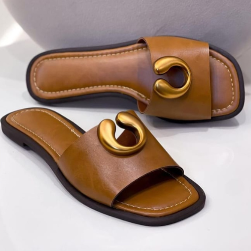 Seu design combina a leveza orgânica do couro com o brilho moderno do metal dourado, que repousa como uma joia no peito do pé. O adorno em argola, marcante e atemporal, traz a força de um acessório de moda para o calçado, transformando-o em peça-chave em qualquer composição.